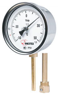 Биметаллический термометр для измерения температуры воздуха, жидких и газообразных рабочих сред, а также сыпучих веществ. Высокая чувствительность прибора делает его незаменимым в составе промышленных установок, лабораторного оборудования и при оснащении коммунальных сетей. В номенклатуре наших изделий вы без труда отыщете любой термометр – осевой либо радиальный, с необходимым диаметром корпуса, погружные и накладные модели, с защитной гильзой из латуни либо нержавеющей стали.Термометр биметаллический широко используется в промышленности и коммунальных службах. Обладает высокой надёжностью конструкции и большим запасом прочности. Принцип его функционирования основан на разности температурного расширения пластин одинакового размера, которые выполнены из разных металлов. При нагревании либо охлаждении биметаллическая пружина деформируется, благодаря чему стрелка, скоммутированная с её концом, движется по шкале и показывает температуру в определённом диапазоне. Для удобства эксплуатации нами производятся биметаллические термометры с осевым штуцером, расположенным вдоль оси прибора, и с радиальным штуцером, выведенным на корпус сбоку. Термометр с погружной гильзой из металла, показывающий температуру внутри промышленной ёмкости, устойчив к ударным нагрузкам и вибрации.